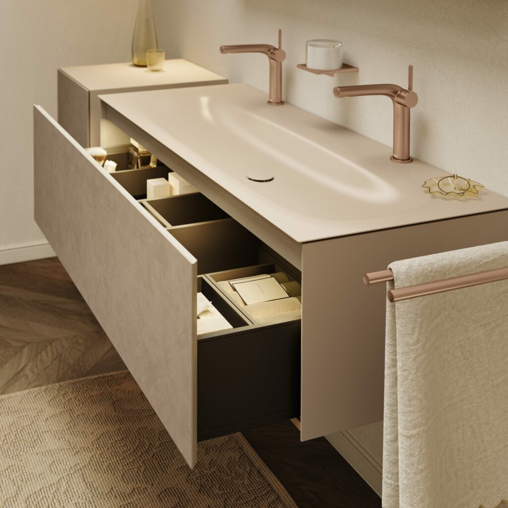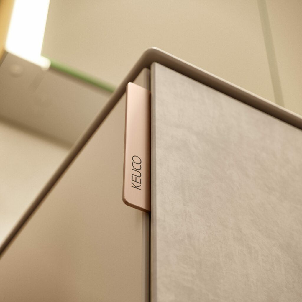 Das durchdachte Farbkonzept der EDITION 11 ART setzt sich nicht nur in den großen Designelementen fort, sondern reicht bis ins kleinste Detail. Der seitliche Griff an den Möbeln ist in den gleichen Oberflächen erhältlich wie verschiedene Armaturen und Accessoires von KEUCO: in Rotgold gebürstet, Messing gebürstet, Titanschwarz gebürstet, Aluminium-finish und Edelstahl-finish, bis hin zu tiefem Schwarz matt oder verchromt. Mit den darüber hinaus verfügbaren PVD-Oberflächen entsteht eine durchgängige visuelle Linie, die das gesamte Badezimmer aufwertet.